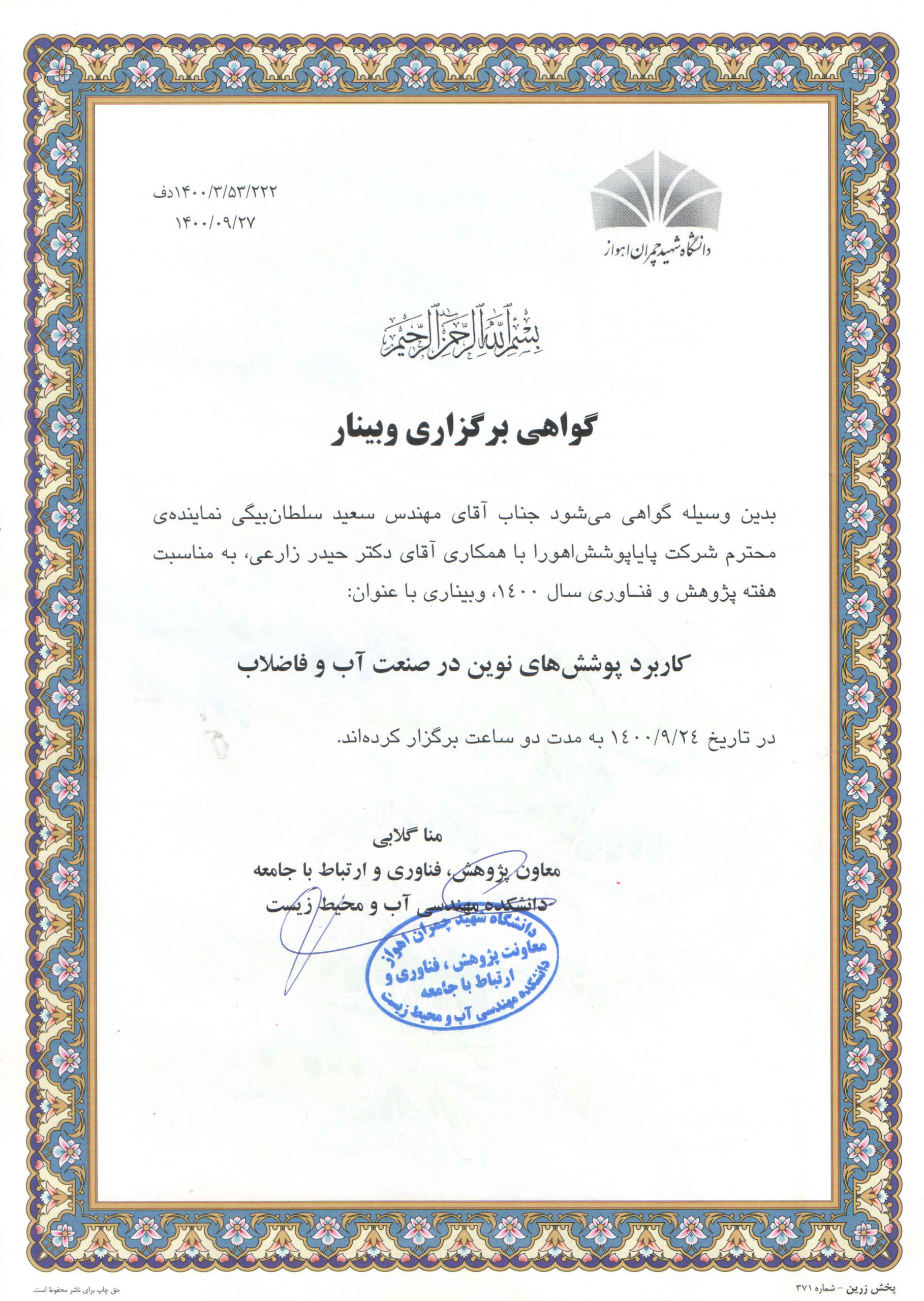 در سال 1399 جهت پوشش دهی سطوح داخلی هاضم های بتنی تصفیه خانه شماره 2 شهر شیراز پیشنهاد فنی خود را به شرکت آب و فاضلاب شیراز ، شرکت ساختمانی ژیان (پیمانکارپروژه)و شرکت ایران آب (مشاور پروژه) ارایه دادیم و در نهایت در جلسه ای که در محل شرکت ایران آب در تهران با مهندس مشاور طرح و نمایندگان پیمانکار داشتیم شرکت پایاپوشش مورد تایید قرار گرفت.